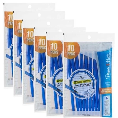Paper Mate Blue Ink Ball Point Pen 10 Pens 6 Packs Ballpoint pen for reliable writing you can trust Time tested ink is the perfect partner for everyday writing 1.0mm medium point for bold accuracy Slim easy to hold design is ideal for restaurants offices and classrooms Includes 10 ballpoint pens with vivid blue ink.